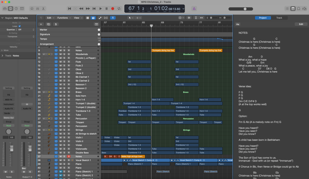 The next step of the journey for me was then to gather everything in Logic, calling up the orchestral template I had created for the instrumentation of the Worthing Philharmonic I was working for. Voicenotes of oboe ideas then turned into a midi translation of it and ideas for percussion impact and markers for section also became audible.
