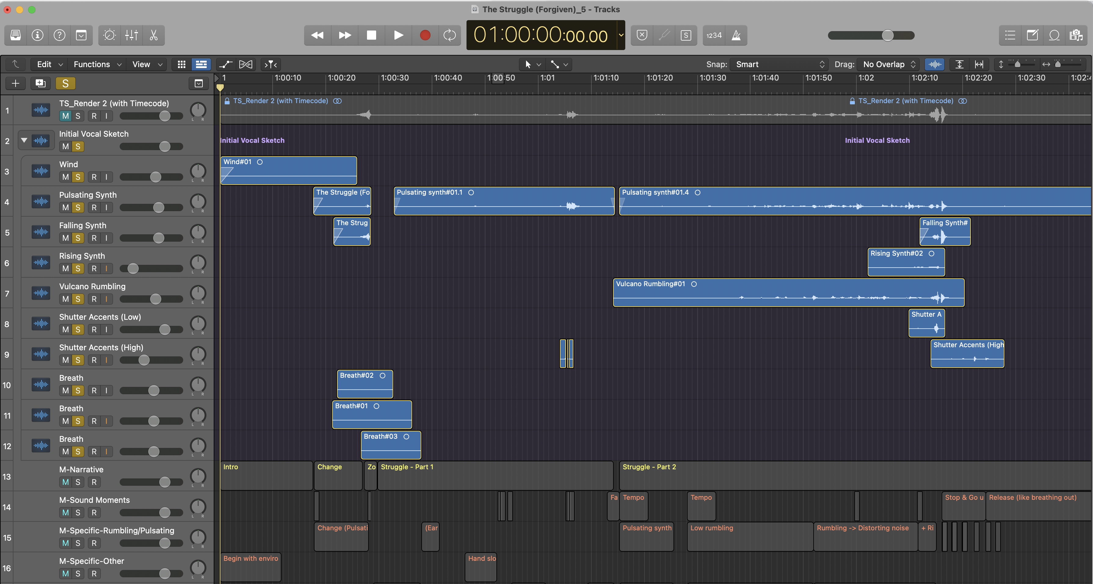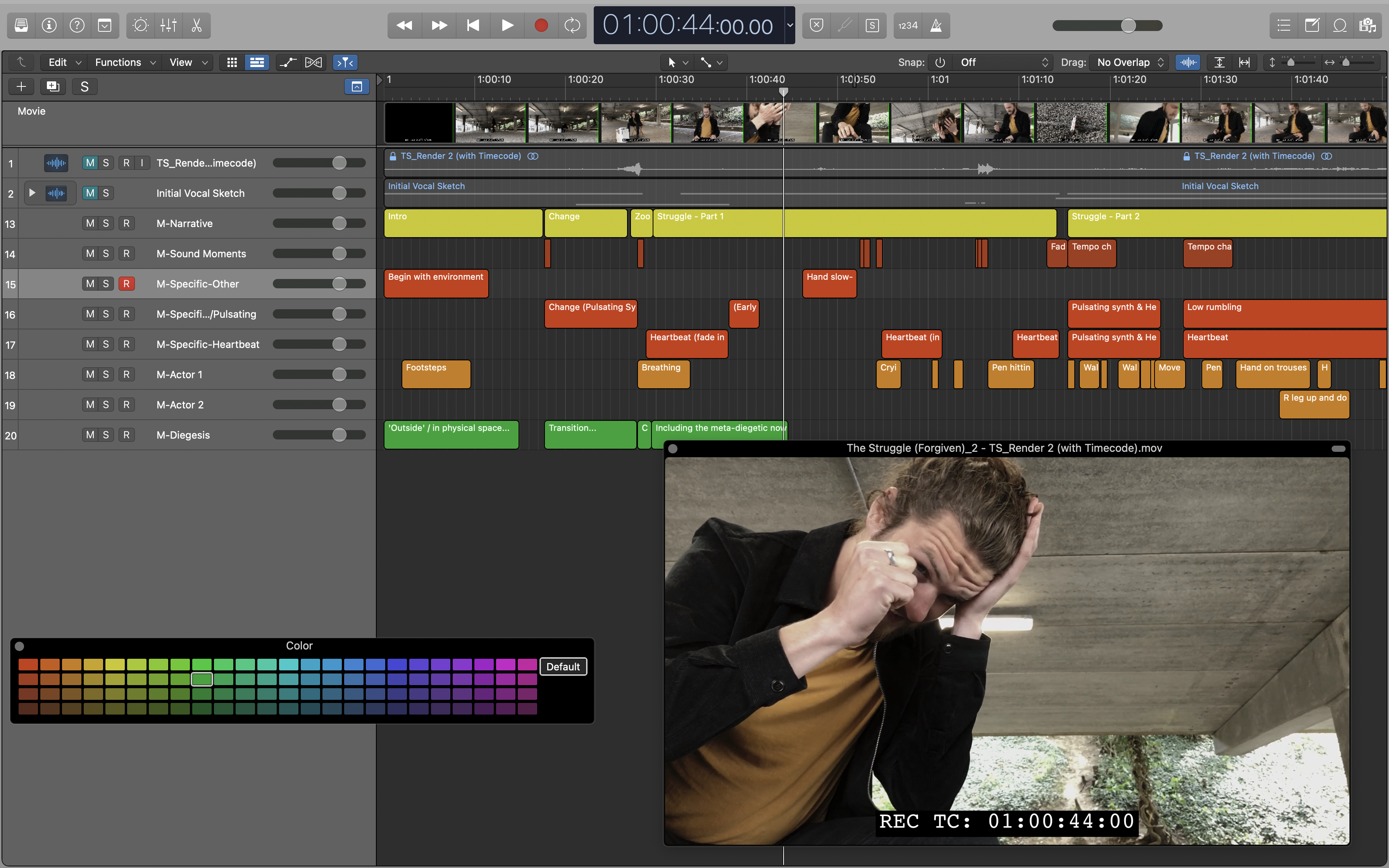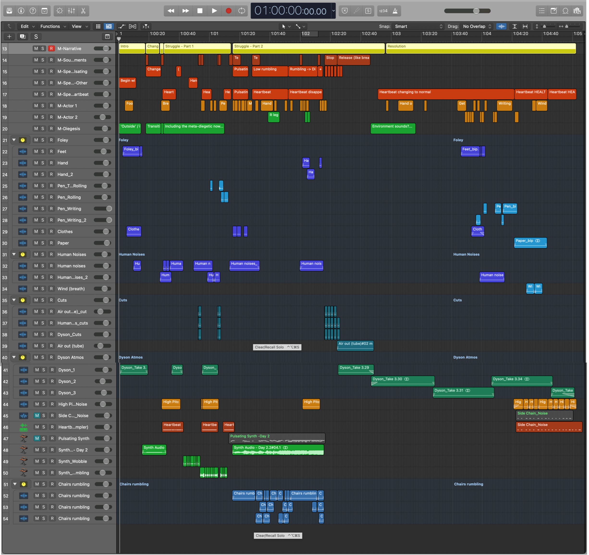 One task then was to map out the narrative, the other to identify key moments which would be relevant to the sound design, such as important scene changes, build ups or foley (e.g., sounds of the actor) that would need to be recorded for certain points. From my musical background I looked at this part of the process as creating the sound score, so to speak.