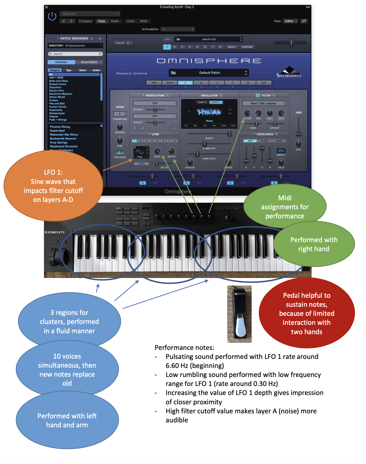 The graphic below shows the Omnisphere 2 patch and how the different knobs and sections of keys of the midi controller were assigned.