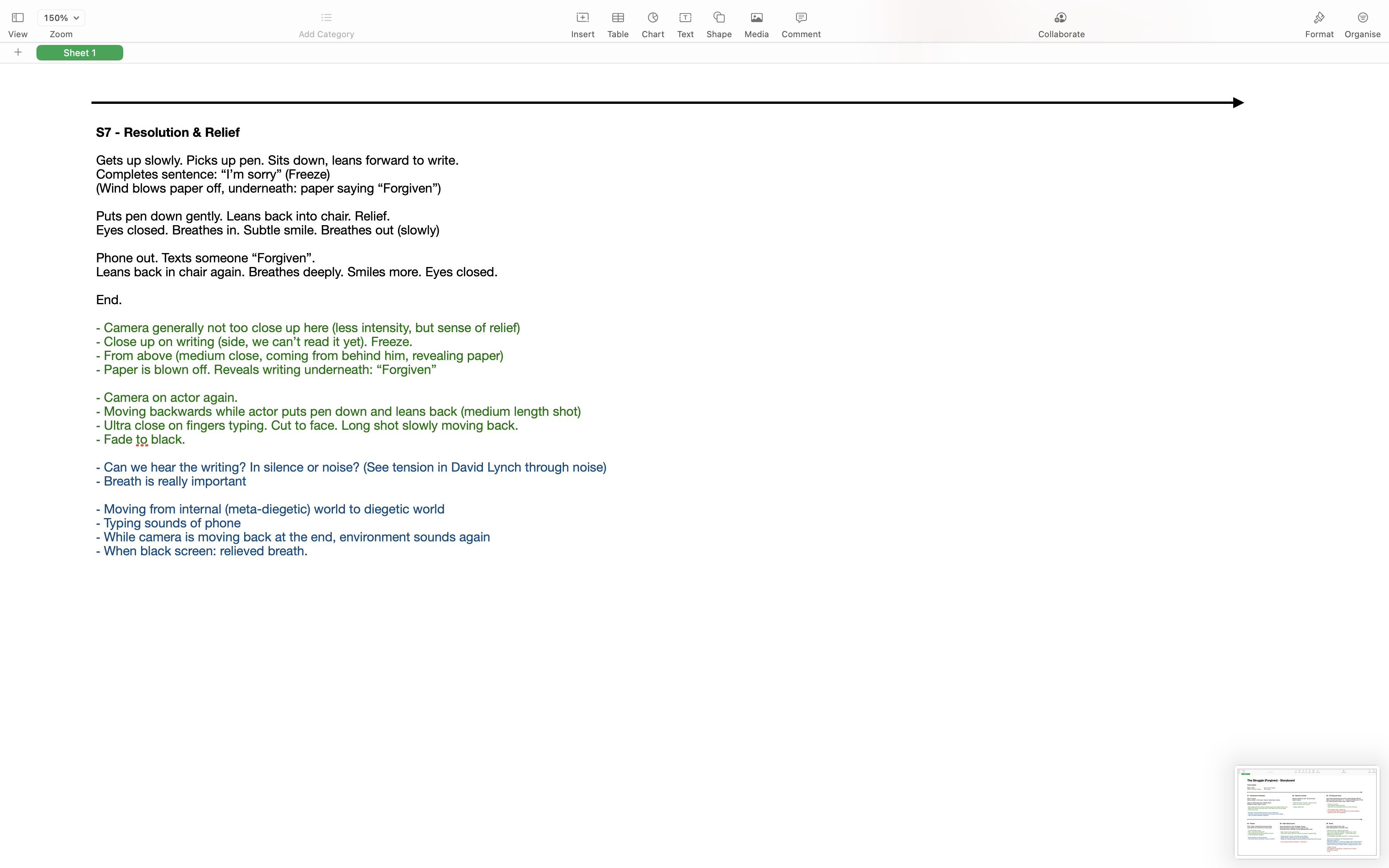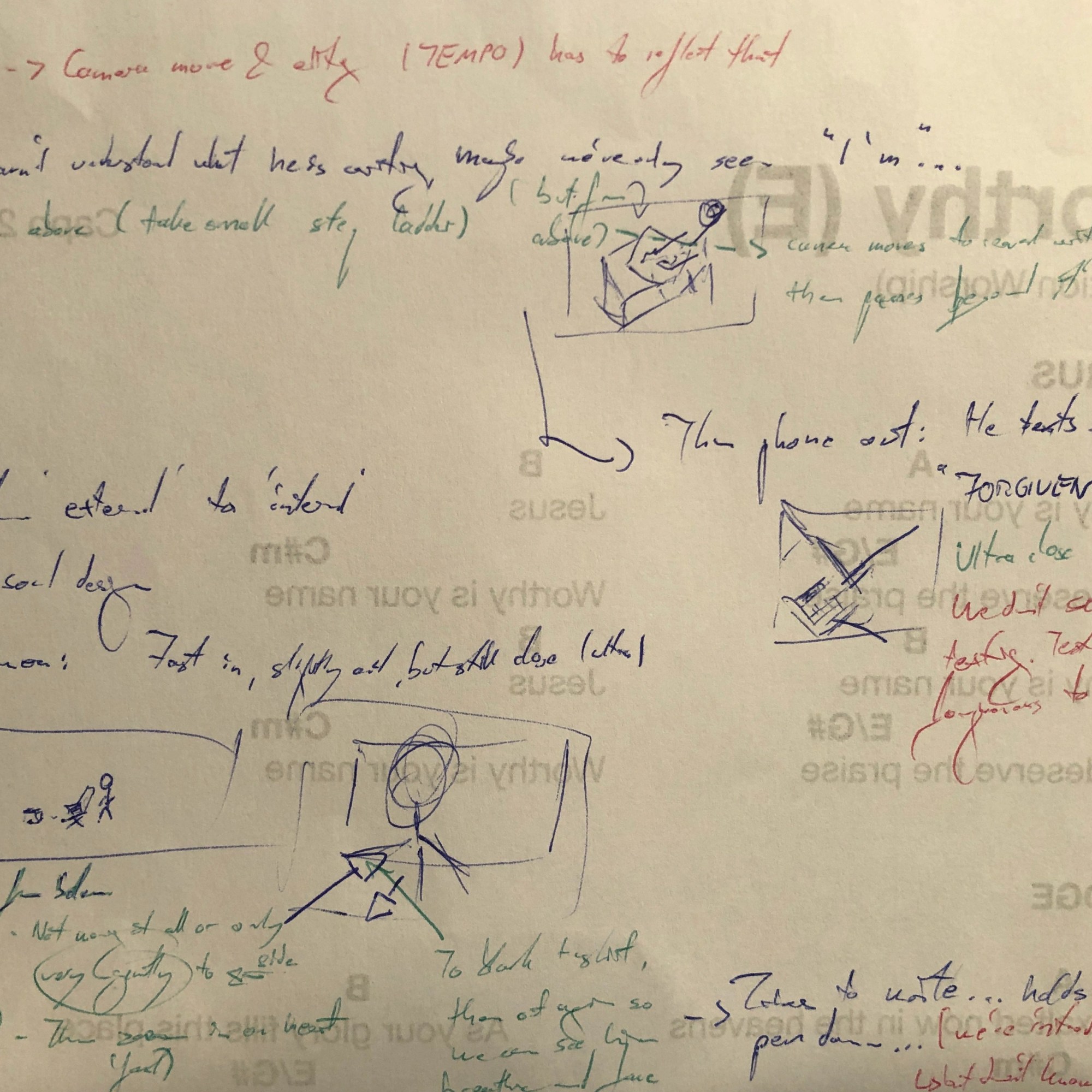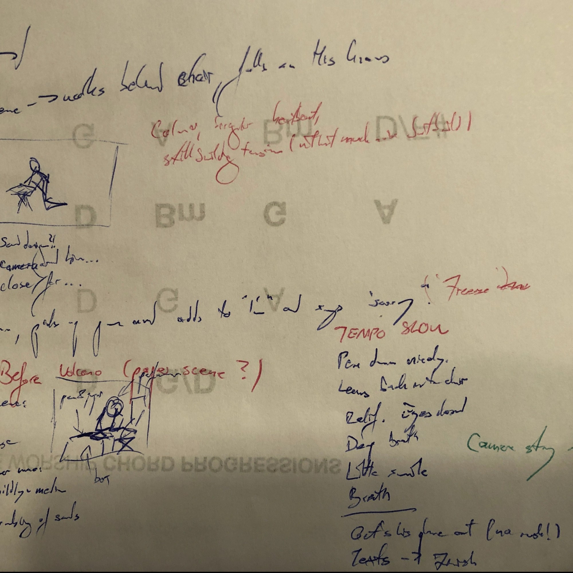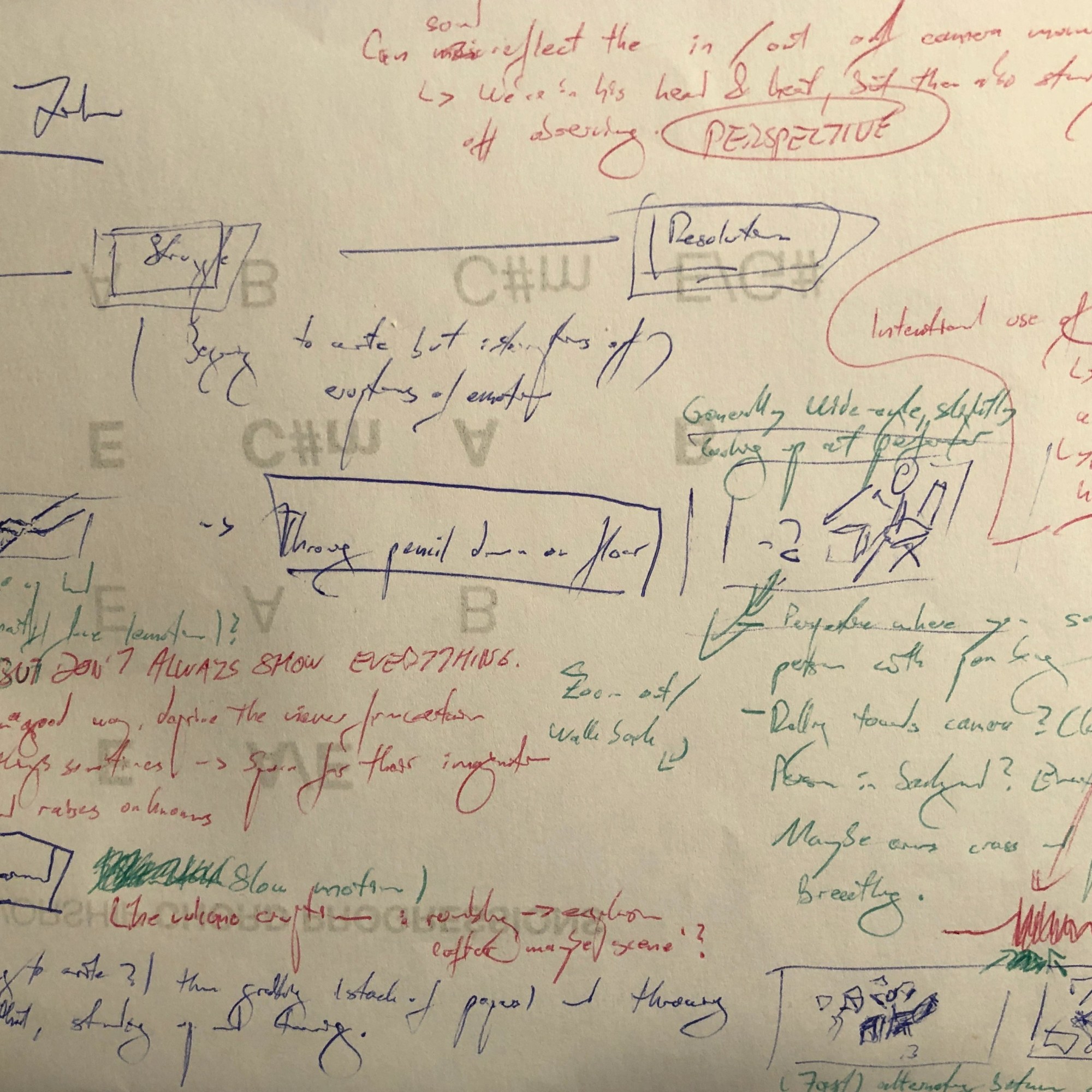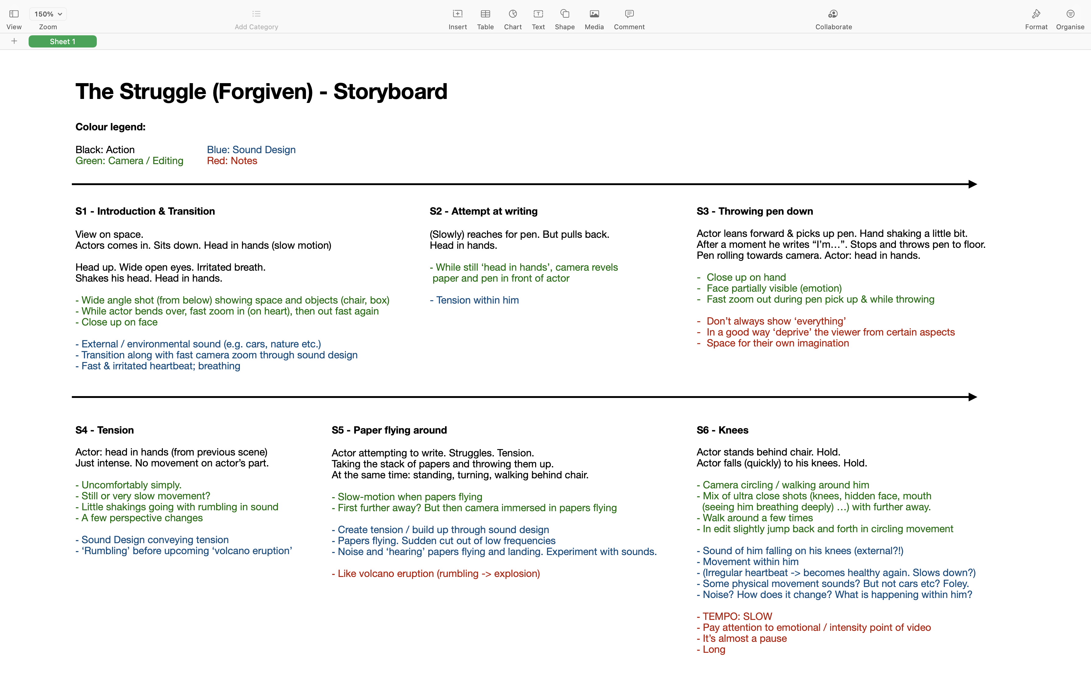 The initial brainstorming was then developed into a more overseeable and actually readable version. The different coloured notes encompass thoughts on action (black), camera / editing (green), sound design (blue) and other notes (red).